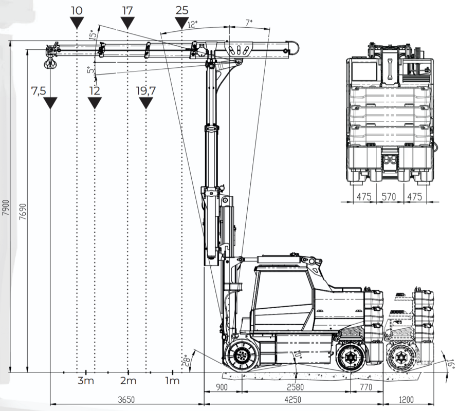 - Remote control (also driving possible, load display) - work lights - 2x cameras - Removable counterweights 6080 kg